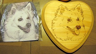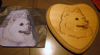 Sherry said she’d like woodburnings done of Sake & Sitka, so I pulled a couple nice shots of them out of the Christmas photos, converted them to sketches, and transferred them to wood. The whole project was delayed because I couldn’t find my woodburning kit, but I finally dug it out of the unpacked items in the garage. Once I got the outlines done I added the little details that make them really look like the individuals – that’s where the art comes in! I was really happy with how these turned out, I think they do look like them, and Scott and Sherry love them πŸ™‚