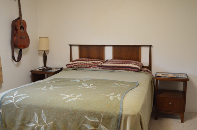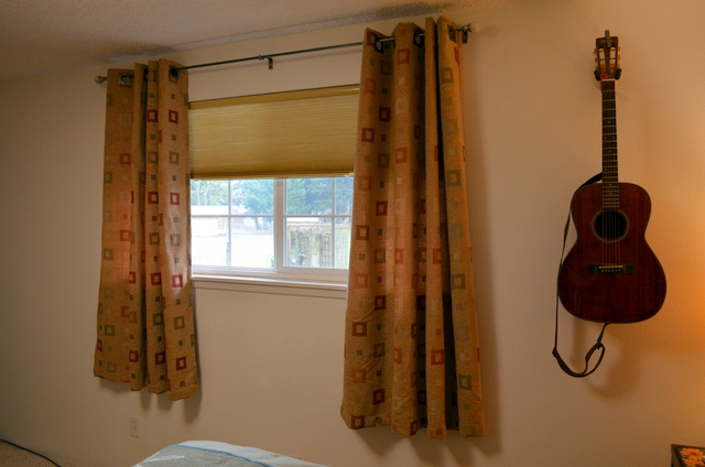 A week or so ago we got our special order pull down shade for the window, and got a nice heavy curtain to go over it with a fun vintage-looking pattern. That helps keep it dark so we can sleep in on the weekends, and keeps it warmer by insulating the window. My guitar is hanging in the bedroom too. I like having the guitar hanging up because it keeps it safe from dogs, but makes it really convenient to just grab off the wall and play.