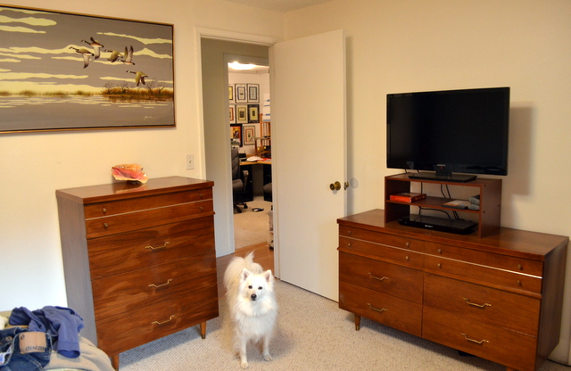And I’ve shown off our pretty vintage dressers before, but I don’t think I’ve shared the cool vintage painting we picked up of Canadian Geese landing on a lake. I really like it, and it has an interesting style that matches up with the rest of the room.