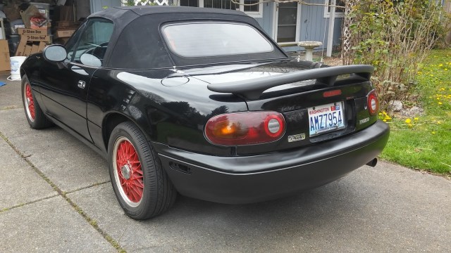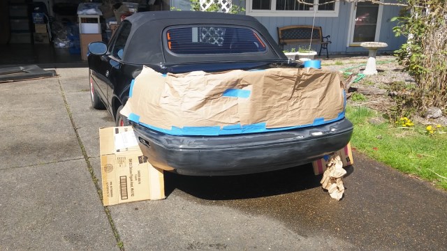 The rear bumper on the Miata was looking pretty bad, with a cracked and peeling clear coat. One sunny Saturday I got in the mood to do something about it. I also have these Rod Millen Motorsports side skirts I bought for it a couple years ago, so I decided to paint those as well.