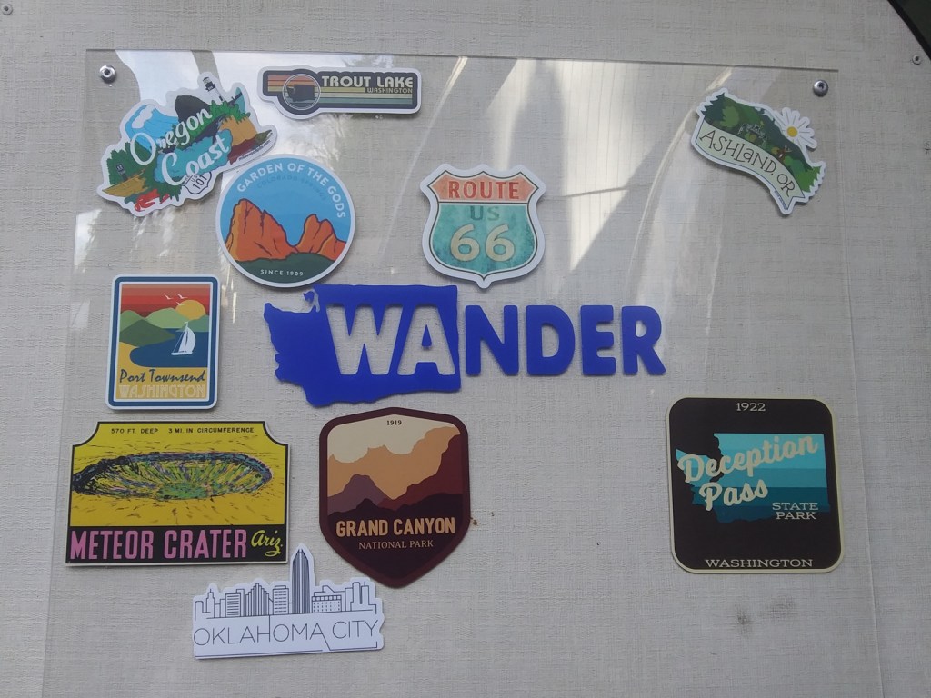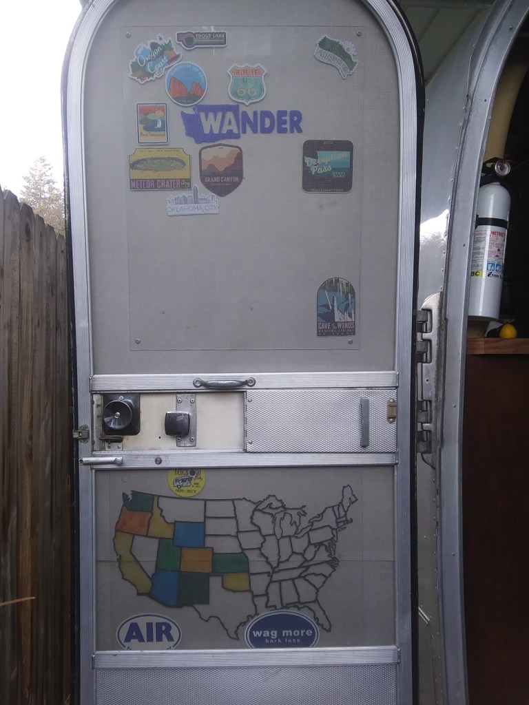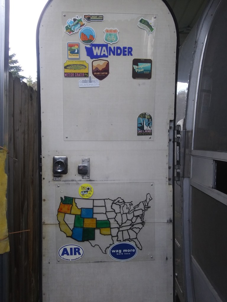 I’m hoping we will be able to get the Airstream out for more trips this summer. We keep meaning to, and every year something seems to stop us. While camping at Deception Pass I got the idea of making a sticker wall for places we’d gone. I picked up a couple stickers there, and then I went on Etsy and found stickers for the other significant places we had visited in the trailer already. I placed them on a plexi sheet and riveted it to the inside skin of the door of the trailer. I also mounted my US Map of states visited down below.
