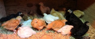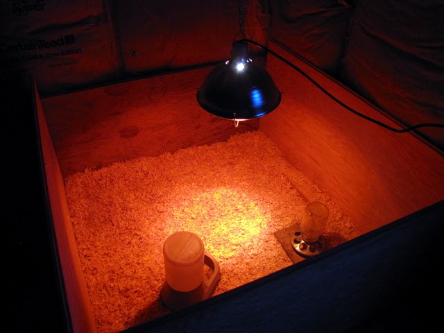 I set up a 4 x 4ft brooder box in the chicken shed, with a heat lamp hanging from the ceiling on a chain, and food and water inside. The floor is covered in vinyl to protect it, and that is covered in wood chips. This same system worked great for the turkey chicks last year. Now I just need a cover to keep the cat out.