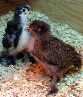 My chicks are around 5 weeks old now, and I guess they’d properly be called pullets (the girls) and cockerels (the boys).