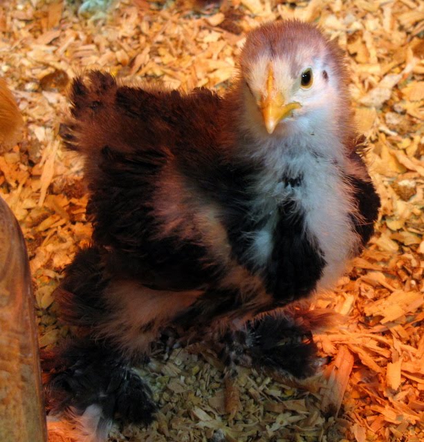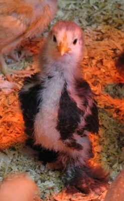 The rest of the chicks are doing fine, active and happy. When I went to check on them this morning I found them all arranged in a perfect half circle around the hot spot from the lamp. They are picking the temperature that is the most comfortable. The sickly one is in the lower right, the little black and white one who is sitting a little closer to the light.