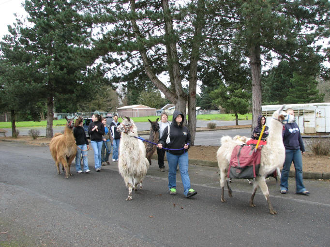 I load up the llamas and bring them to club practice days so they can work with them, or they come to my house to practice. We teach them about how to show off your animal to the judge, prepare them for the questions the judge will ask, and then we set up obstacles and get the animals used to them – things like going over little jumps, walking through brush, walking over a tarp.
