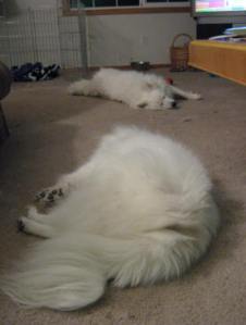 Alki is still doing well, approaching two years since her cancer diagnosis, the beginning of that long adventure. She still takes medicines twice a day, and we check in with her oncologist monthly. She’s had some age related problems creeping up on her – dimming eyesight and not hearing well. Sometimes those are a blessing, because she doesn’t set off barking every time she hears the neighbor slam their car door – in fact she sleeps through most deliverymen now. I can clickertrain Barclay in the other room and she doesn’t hear it (which is good because otherwise she comes and demands treats). But we do have to be careful not to startle her when she’s sleeping. Usually a gentle touch wakes her up enough and she’ll roll over for a tummy rub. Dogs know the best things in life are free!