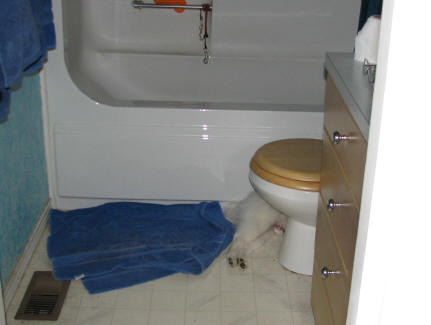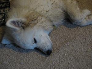 We’re having a little heat wave, and poor little Barclay has been feeling hot anyway, which is why he likes sleeping on the cold bathroom floor, snuggled up to the toilet, or lays in the bathtub with a little water in it. I remember Alki going through the same thing when she was a puppy. So today for the first time we had to turn on the AC, and Barclay parked himself over the vent to take a nap! Ah cool air, right on his little tum tum!
