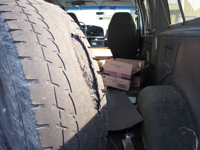 Last Thursday I drove the van into town to meet my husband at the theater and thought ‘boy this thing is riding like..uh..poorly’. Yes, that’s what I thought 😉 But when I got downtown and Dave and I walked around it, we didn’t see anything wrong. So I drove it a couple more days, and then Saturday I drove it to work, and walked back outside to get something out of it and saw this on the inside of the passenger side wheel!