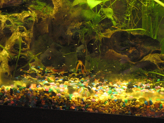 These are p. estherae, also called Red Zebras or Cobalt Zebras, which as you can see is stretching it a bit in either direction. The red is not what I would call red, in fact I would call them yellow. I only have one blue male, and it is a pale blue. This is my 110g display tank in the living room. The amazing thing about these fish is that they are ALL estherae, despite the wild variations in color. If the solid yellow breed with the blue male, they will produce more solid yellow babies, and the dominant males eventually turn blue. In my tank there is only one yellow male dominant enough to show his blue colors.