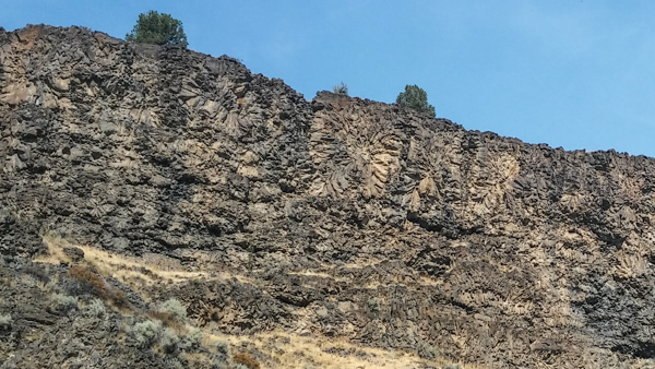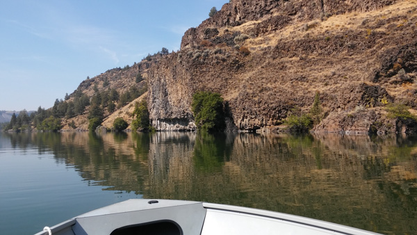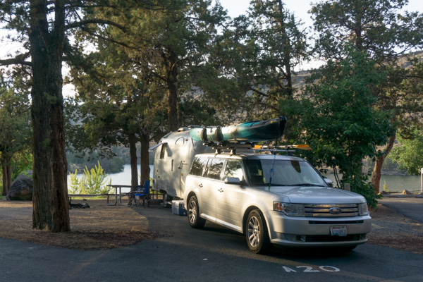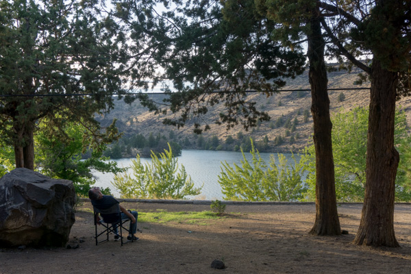 I was a little worried about heading for Eastern Oregon in August, with no AC, and no electricity to plug into to run it anyway. Turns out Pelton Park is actually a really nice park with lots of trees and shade. I loved our spot with a view of the lake. I wish we’d had one of those front-bedroom Airstreams with the table in the back – the pretty view was out our bathroom window!