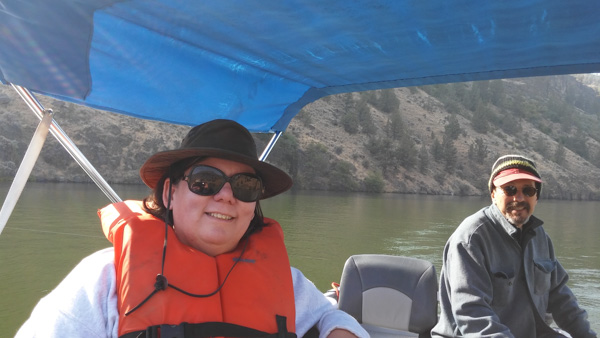 Afterwards we had lunch, and the astronaut talked to us and answered questions, and then we helped clean up, folding chairs and stacking tables. There was no cell service there, so to get reception you had to drive up to the top of the hill, and you could also see the highway from there. After brunch we had gone up there and saw the highway was crawling with people heading back to town, so we went back to camp to relax. Back at the campground we crashed for a bit, then while Dave was napping I went to see what Janet was up to. I didn’t find her, but I found Carolyn and Loren. I just started visiting with them, when Janet popped up and said Gail had rented a boat and there were two more spots! Carolyn didn’t want to go, so I went for it. We had a pontoon boat! Gail drove us down to the other campground and then down the lake a ways. Gary was stretched out on the front deck, Jim had his mandolin out plunking away, everyone was chatting and telling stories, it was fantastic!