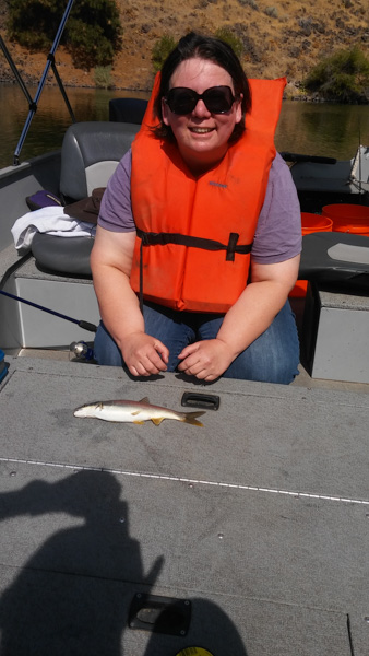 I didn’t know what it was, so I released it. Turned out it was a Northern Pikeminnow and they are invasive, and you’re supposed to keep them if you catch them. Oh well. We also saw some deer up on the hills, and a black cow that was just hanging out by itself.