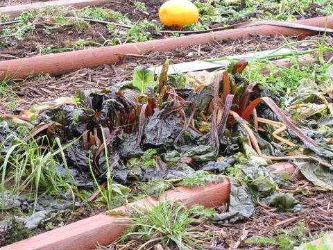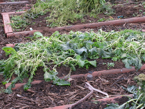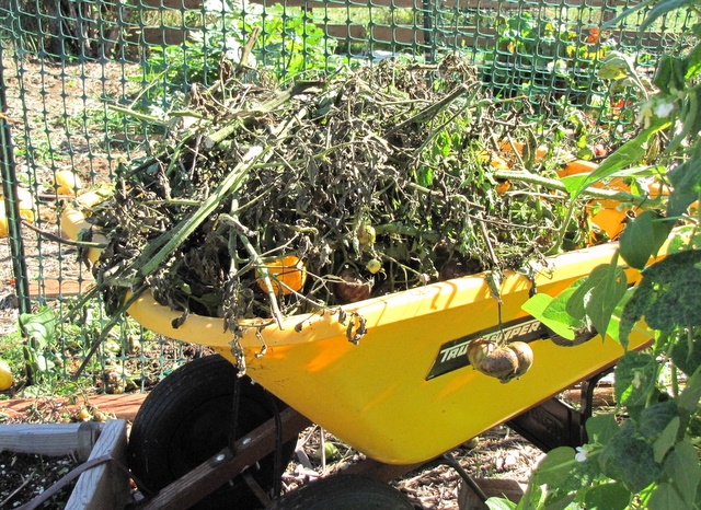 The deep bed method had backfired on me as it piled up faster than I was keeping up with it. For the last two weeks I’ve been trying to find time to get out there and clean it up. I cleared out THREE heaping wheelbarrow loads – and I think it’s an 8 cubic foot wheelbarrow! That’s a lot of crap!