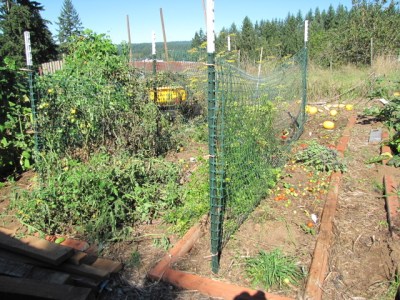 I took the cart over to the drainfield area and started loading up concrete blocks. Each one had to be wrestled out of the ground, wiggling them back and forth like a loose tooth. I loaded 12 into the cart at a time and took them over to the area outside my garden next to the compost piles and..