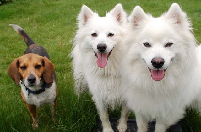 First off, I have to say Jack is a very nice dog. He’s well behaved, and you hardly even notice he’s around. He mostly sleeps and begs for food, and occasionally plays with the other dogs. His downsides would be that the baying really gets on my nerves, like nails on a chalkboard, and that he is kind of a third wheel to the eskimo antics that go on around here. The eskimos are in-your-face, lets go have some fun, constant interaction party dogs! They are always thinking of new things to do, and they want you to join in. They bring you stuff to see if you’ll come play or try to get it away. They pretty much overshadow poor Jack in every way, and run circles around him in the yard while he races to keep up with the faster, higher-energy eskies.