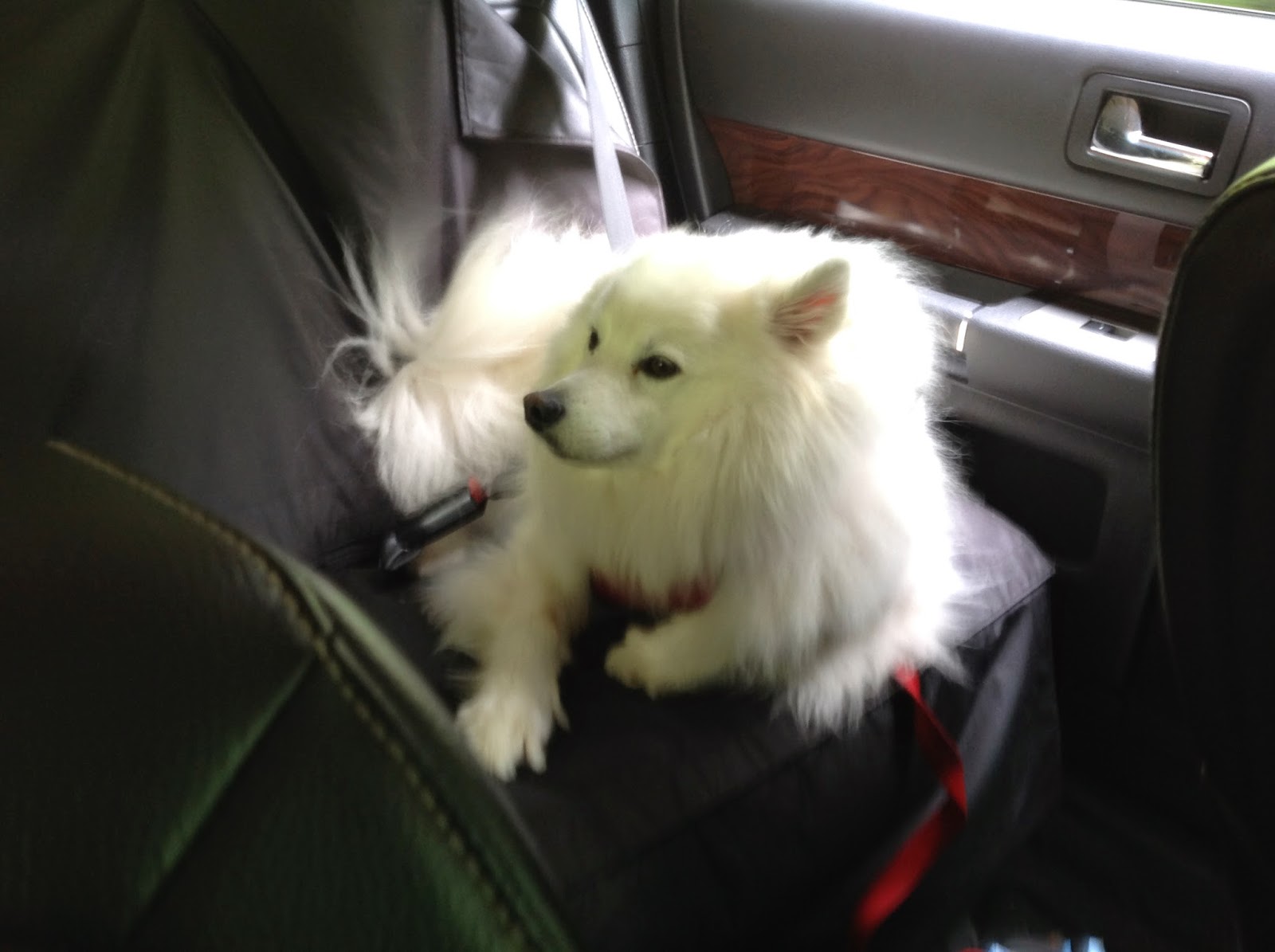 The dogs had to put up with the new travel rules in the Flex, namely that they have to be buckled in (since they are surrounded by airbags, and if there was an accident I want them to be safe). They both have new Sleepypod Click-It harnesses that fasten into the safety anchors in the back seat and keep them securely in place.