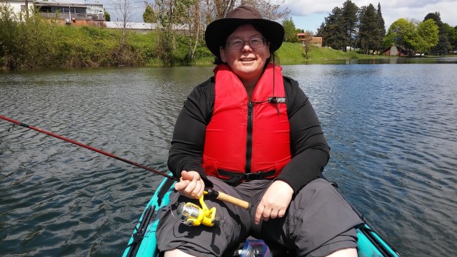 We’ve taken it out three more times, each time to Lacamas Lake, which is much closer to home than Woodland (though I really like Horseshoe Lake, so I’m sure we’ll be back there again). The first time there was a church group of paddlers there, and we paddled quite a ways down the lake with them, then stopped to fish for a while.