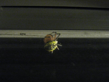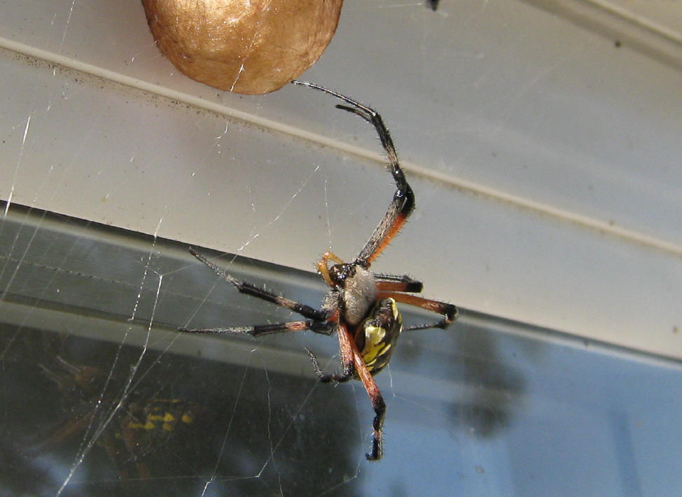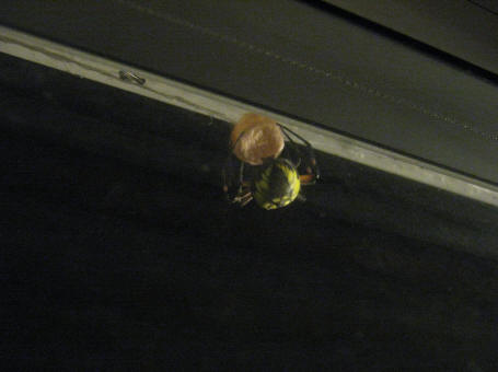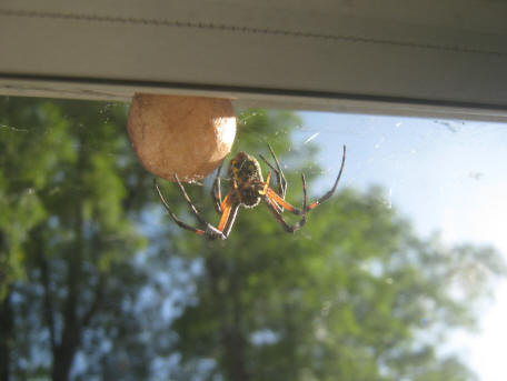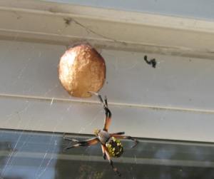 After spending a day hanging out on her egg sac, she disappeared around sunset. It was time to bring the cats in anyway, so I walked around to the backdoor with a flashlight to look for her. Mouse showed up just as I spotted her, skittering across the deck – yikes! She was HUGE down on the ground! Unfortunately Mouse saw her and pounced, and before I could step in to help, Charlotte grabbed a web and zipped back up out of the cat’s reach! I grabbed Mouse and took her inside. I checked on the spider a couple more times, and by evening she had dissapeared again, and hadn’t returned by this morning. So I’m thinking she’s done her job and gone. Now we just have to decide if we want to leave the eggs there and see if they hatch in the spring, or move them out to the orchard somewhere and let them hatch there – a little farther from the house!